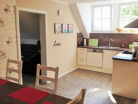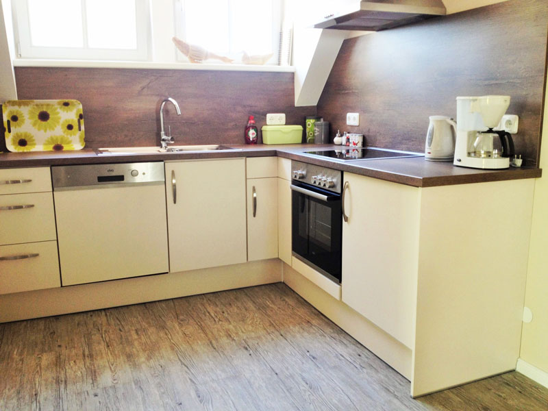 Die komplett ausgestatette Küche hat ein Ceran-Kochfeld ,Backofen, Geschirrspüler und einen Kühlschrank mit Gefrierfach.